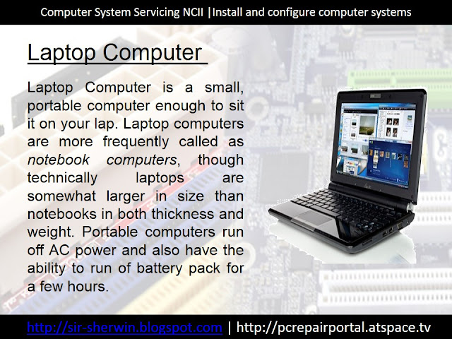 2. Laptop Computer is a small, portable computer enough to sit it on your lap. Laptop computers are more frequently called as notebook computers, though technically laptops are somewhat larger in size than notebooks in both thickness and weight. Portable computers run off AC power and also have the ability to run of battery pack for a few hours.